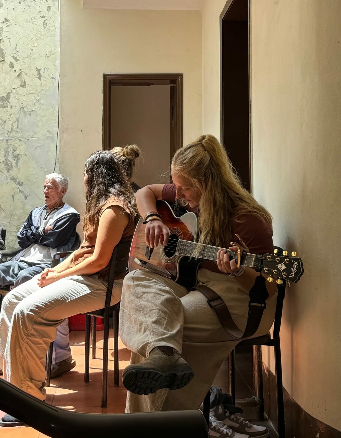 I’m one of three worship coordinators for the squad. As coordinators we decided to have squad worship every Monday night on our rooftop terrace. Last Monday I got to lead our squad with my guitar in some worship. This is a gift that the Lord has been refining in me very quickly since being here. I only started teaching myself to play just over a year ago, and never would have dreamed of being a worship leader. The other day I was able to go to a senior center with some others on the squad. They were asking for someone who could play guitar to come along. While some painted nails and cut hair for those in the center, I got to sing some English and Spanish worship for them. Many seniors got up to dance, it was beautiful and heartwarming, and I’m so glad that the Lord blessed me to use my gift in that way.